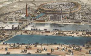 titre “Map of Paris - London Edward Stanford”. Superbe plan monumental figurant les travaux d’agrandissement du Baron Haussmann depuis 1851, et l’un des premiers plans figurant le Paris moderne. Tous les travaux sont signalés à l’aquarelle rouge : en rouge uni, les voies ouvertes (boulevards Sébastopol, Magenta, Malesherbes, avenue de l’Empereur, future avenue du Trocadéro en 1871, boulevard et place Saint-Michel, créés en 1855, etc), en rouge hachuré, les voies modifiées (boulevards de la Chapelle, de Grenelle, avenue du Roi de Rome, devenue avenue Kléber en 1879, etc), et par un double trait rouge, les voies projetées (boulevard Pereire, etc). Sont également signalés à l’aquarelle de couleur marron les monuments et bâtiments publics ayant été rénovés ou construits sous Haussmann (Notre-Dame, la Halle aux Vins, les Halles Centrales, les Palais du Louvre et des Tuileries, le Tribunal de Commerce, achevé en 1864, l’Opéra Garnier, construit entre 1861 et 1875, ou encore le Palais de l’Industrie, construit pour l’Exposition Universelle de 1855). Tout autour de la ville, on distingue très nettement l’enceinte de Thiers, du nom de l’homme politique qui conçut le projet. Construite entre 1841 et 1844, elle était constituée de 94 bastions, et englobait non seulement Paris mais aussi les communes environnantes. Très bel exemplaire finement aquarellé à l’époque. Petites taches sur la reliure de toile. (Pinon & Le Boudec, pp. 110-111).