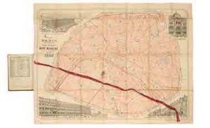 titre en lettres dorées sur le premier plat, et vue générale des Magasins du Bon Marché sur le second plat. Rare et beau plan lithographié de Paris utilisant le système du ruban indicateur, permettant de trouver instantanément les rues au moyen d’un ruban métrique de soie fixé sur le plan. Il est orné de quatre grandes vignettes figurant les magasins du Bon Marché, dont on voit les bâtiments au centre du plan. Le plan fut publié par les Magasins du Bon Marché en 1889, année de la dix-septième Exposition Universelle, et la quatrième se tenant à Paris, lors de laquelle fut inaugurée la Tour Eiffel. Les 63 pages accompagnant le plan, intitulées “Souvenir des Magasins du Bon Marché”, sont illustrées de 2 portraits hors texte d’Aristide Boucicaut et de son épouse, créateurs du Bon Marché en 1852, d’une vue générale des magasins du Bon Marché à double page, de 2 vues à pleine page du Bon Marché, et de 2 plans en couleurs de l’Exposition Universelle de 1889, dont l’un à double page. Le texte contient un calendrier pour l’année 1889, une biographie des époux Boucicaut, les moyens de transport conduisant au Bon Marché, une nomenclature des principaux articles vendus au Bon Marché, un descriptif de l’Exposition Universelle, et une nomenclature alphabétique des rues. Bel exemplaire en coloris de l’époque. Dorure des plats passée, notamment pour l’illustration du second plat.