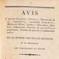 la défense d’ouvrir les boutiques et de travailler les dimanches et fêtes. Paris, imprimerie de J. Moronval, sans date [1791 ?]. Plaquette in-8 de 8 pp., couverture muette moderne. Première édition. “Cette défense (disent certains) … fera un tort considérable aux marchands… nous ruinera…, nous réduira à un triste désœuvrement dans nos maisons, …nous fait perdre un jour de notre semaine et nous est préjudiciable. (…) Pour réponse générale à tous ceux qui crient tant contre l’Ordonnance du 7 juin dernier, je leur dirai que cette observation des dimanches et fêtes que commande l’Ordonnance n’est point une innovation de la part de notre Souverain ; elle est aussi ancienne que la Monarchie française ; vos ancêtres et une partie de vous autres yfurent soumis jusqu’à l’époque de la Révolution qui l’a interrompue… je leur dirai enfin que tout honnête homme doit avoir une religion, que tout honnête homme doit être soumis aux lois de son pays.” Rousseurs.