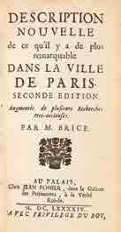 Brice (Germain). Description nouvelle de ce qu’il y ade plus remarquable dans la ville de Paris. Seconde édition. Augmentée de plusieurs recherches très curieuses. Au Palais, chez Jean Pohier, 1694. 2 tomes en un volume in-12, veau fauve marbré,