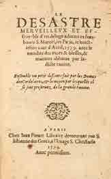 Le Désastre merveilleux et effroyable d’un déluge advenu es fauxbours S. Marcel, les Paris, le huictiesme jour d’avril, 1579, avec le nombre des mors & blessés, & maisons abbatue par ladicte ravine. Ensemble un petit discours fait par les Dames