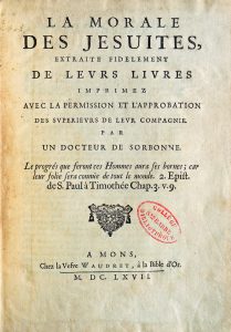 Perrault (Nicolas). La Morale Des Jésuites. Extraite fidèlement de leurs livres... Mons, Veuve Waudret, 1667. Un volume, in-4, de (20) ff., 755 pp., (1) f., pleine reliure de l’époque en veau granité. Dos à 5 nerfs orné et doré portant le titre
