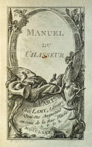 chasseur. Paris, Saugrain & Lamy, 1780. Un volume, in-12, de titre-frontispice, titre, 207 pp., 37 pp., 3 pp., bl., pleine reliure en maroquin brun. Dos à 5 nerfs orné de caissons à froid et portant le titre doré, double filet à froid d’encadrement sur les plats, filet doré sur les coupes, fine dentelle intérieure dorée, non rogné. Bel exemplaire dans une reliure stricte en maroquin. Bien complet des 37 pages de fanfares de chasse.