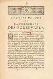 relative à la création des boulevards à Paris au début du xviiie siècle. Un jeune homme, “entrant dans la carrière du monde”, s’entiche d’une Mme de *** qui lui vante les boulevards : “Est-il rien au monde de plus ennuyeux qu’une avenue toute droite, tirée au cordeau, étouffée d’un côté, bordée de l’autre d’un bassin maussade à la vue ? Encore si l’on pouvoit s’y promener en équipage, peut-être passeroit-on sur tant de désagrémens. Comparez à présent tout cela aux délicieux Boulevards : vous verrez si votre insipide Cours gagne au parallèle. Ce spectacle bruyant d’équipages, de livrées, de chevaux, de diables, de culs-de-singes, de désobligeantes, de capriolets : d’un côté des guinguettes, des marais ; les admirables vues de Montfaucon, de Montmartre ; de l’autre, des cabarets, des parades, des spectacles sans nombre, un peuple énorme.” Exemplaire de la bibliothèque Paul Lacombe, avec ex-libris et note autographe : “Par Marescot d’après Tourneux. Voir une note sur l’autre édition reliée avec les folies de la nuit. Celle-ci plus complète paraît être l’édition originale. P.L.” (Lacombe, Bibliographie parisienne, n° 136.- Lacombe, Catalogue, n° 1440.)