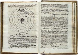 Tycho Brahé. Manuscrit du xviie siècle de 300 pages illustrées de figures dessinées. Un volume, in-8, (20,4 x 12 cm) demi-reliure en veau de l’époque. Dos à 5 nerfs orné de fleurons d’entre-nerfs et d’un titre gravés à froid, plats en parchemin de réemploi recouvert de textes manuscrit en gothique avec lettrines en couleurs, tranches jaspées. Usures du temps à la reliure. 304 pp., sur papier chiffon vergé recouvertes d’une écriture serrée manuscrite en latin, et illustrées de 34 figures dessinées dans et hors texte. Magnétisme : 12 figures, astronomie : 20 figures. Ex-libris contrecollé en page de garde : blason gravé de Anne-Joseph d’Azincourt. Le manuscrit se présente comme un exposé scientifique ayant trois parties indépendantes : Physique (De Corpore naturali inspecie seu de Mondo Coelo, et de Elementis, Generatione et Corruptione rerum, Meteorisque, etc), Magnétisme (Tractatus deMagnete, Historia Magnetis) et Astronomie (de Praxibus Astronomicis, Systema Copernici explicatur, etc). L’ordonnancement de ces exposés est conforme aux manuels universitaires du XVIIe siècle, notamment avec le recours aux « disputationes, abjectiones, quaestiones et reponsiones ». Des phrases interrompues, des ratures, ou des blancs laissés pour les figures confirment que nous sommes en présence de notes rédigées sous la dictée d’un professeur. Les références au vocabulaire scolastique, les auteurs jésuites abondamment cités, les objections à la thèse copernicienne (bien que reconnue comme « très ingénieux système copernicien ») appuyées par les théories du savant jésuite Giovanni Battista Riccioli, renvoient à l’enseignement jésuite de l’époque. Dans la partie « Astronomia », on lit l’indication « Hic Lugduni » (ici à Lyon) au sein d’un exemple de calcul. Cette indication importante du lieu combiné au fait que cet enseignement soit celui d’un jésuite indique que ce manuscrit serait de la main d’un élève du réputé collège jésuite de la Trinité à Lyon. Depuis 1604, l’astronomie y est enseignée avec des scientifiques de renom comme Honoré Fabri (1608-1688), ou Claude François Milliet Dechales (1621-1678), tous deux auteurs féconds au moment de la rédaction de ce manuscrit. Rappelons que le Collège de la Trinité disposera de son propre observatoire astronomique dès 1701. L’analyse de ce manuscrit fait ressortir qu’il ne peut être antérieur à l’année 1650 en raison de la mention des « Tables Rodolphines » de J. B. Morin, parues pour la première fois en 1650. Et dans la partie concernant le magnétisme, les nombreux auteurs contemporains cités (Gassendi, Maignan, Descartes, Galilée, Kircher, etc.) ont vu leurs travaux sur ce sujet publiés après 1650. Enfin, une mention de l’année 1662 est visible dans un exemple de calcul d’astronomie. Les noms des enseignants jésuites ayant eu en charge les cours scientifiques à Lyon à partir de 1657 sont les Pères Claude-François Milliet Dechales (1657-1660), Pierre du Port (1660-1661), Jean Bertet (1661-1665) et Pierre Violet (1665-1667) (François de Dainville - in Revue d’histoire des sciences et de leurs applications, 1954). L’ex-libris gravé qui figure en tête du manuscrit est le blason d’Anne-Joseph d’Azincourt (1644-1689) (cf. Martin J. et Meurgey J. Armorial du pays de Tournus, Champion, 1920 - Marchand M. Blazons de Bourgogne tirés des armoriaux locaux, généraux et manuscrits, Marconnay, 1975-2001). La famille d’Azincourt est originaire de Tournus en Saône-et-Loire (Bourgogne) et elle y restera jusqu’à la fin du XVIIe siècle. Anne-Joseph d’Azincourt, né en 1644 à Tournus, fut avocat et jurisconsulte, puis échevin de la ville de Dijon en 1687. Il est le co-auteur de « Texte de la Coutume du Duché de Bourgogne avec les notes de Dumoulin » (Dijon, Michaud, 1677). Il est mort le 16mars 1689 à l’âge de 45 ans. Il aura pris note de ses cours au début des années 1660. Anne-Joseph d’Azincourt est le fils de Charles d’Azincourt, médecin ordinaire de Henri II de Condé vers 1645. Charles d’Azincourt pouvait être d’autant plus sensible à la qualité de l’enseignement scientifique dispensé à son fils, qu’en tant que médecin de Henri II de Condé, il a eu pour confrère l’abbé Bourdelot, alors lui-même également médecin des Princes de Condé, et animateur de la célèbre académie scientifique qui porta son nom durant près d’un demi-siècle (1639-1685).