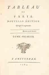 Paris, complet des douze volumes requis. Un document de première main sur le Paris des dernières années de l’Ancien Régime : il connut plusieurs éditions successives à partir de 1781, en deux volumes d’abord, puis en huit, en douze volumes enfin. “Quelques années avant la Révolution, un homme sillonne les rues de Paris, se faufile dans la foule, s’arrête devant les boutiques, observe le travail des artisans, écoute les cris des vendeurs ambulants et les complaintes des chanteurs des rues ; en homme des Lumières, il songe qu’il faudrait élargir les voies, créer des trottoirs et des latrines, améliorer l’éclairage, mais aussi adoucir le sort des misérables. Toutes ses observations, toutes ses réflexions, il les note en s’appuyant sur les bornes au coin des rues. De ces fragments accumulés pendant trente ans, Louis Sébastien Mercier (1740-1814), à la fois romancier, dramaturge, lexicologue, journaliste, essayiste et ardent polémiste, fera un ouvrage en douze volumes, le Tableau de Paris, qui le rendra célèbre dans toute l’Europe, nous léguant ainsi un document irremplaçable sur le Paris de cette époque” (Elisabeth Bourguignat). Exemplaire à toutes marges. Rousseurs par endroits, dos légèrement passés. (Lacombe, 306 : “Édition la meilleure et la plus complète”.- Vicaire, Bibliographie gastronomique, 594 : le bibliographe relève les nombreux chapitres traitant de gastronomie.- Bourguignat, Les Rues de Paris au xviiie siècle ; le regard de Louis Sébastien Mercier, Paris, Musée Carnavalet, 1999).