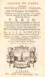 Nemeitz (Joachim-Christoph). Séjour de Paris, c’est-à-dire, instructions fidèles, pour les voiageurs de condition, comment ils se doivent conduire, s’ils veulent faire un bon usage de leur tems & argent, durant leur séjour à Paris. Leide, Jean