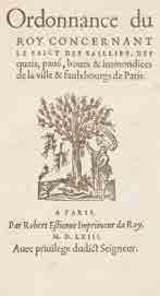 Ordonnance du Roy concernant le faict des saillies, des quais, pavé, boues & immondices de la ville & faulxbourgs de Paris. Paris, Robert Estienne, 1563 [1564]. Petit in-8 de (8) ff., le dernier blanc, soie grenat à la Bradel, pièce de titre de