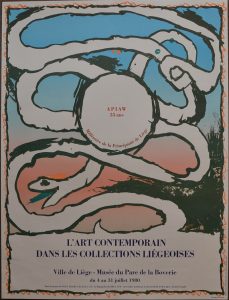 "Utsnitt av hans grafiske verk" [Choix parmi l'oeuvre graphique]. Trondheim, Galleri Riis. Dessin sur acétate insolé sur plaque, imprimé sur papier offset. Dim. : 84,7 x 61,8 cm. Impr. Arte à Paris (Charron, 68)./ IDEM. Affiche (1980). L'Art contemporain dans les collections liégeoises (Musée du Parc de la Boverie à Liège). Dessin sur acétate insolé sur plaque, imprimé sur presse offset. Impr. Arte à Paris. Dim. : 79 x 59,8 cm (Charron, 79)./ Ens. 2 pièces