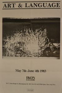 Impression en noir sur papier offset blanc. Dim. : 35 x 50 cm. "Legally and by unanimous agreement of the editors and the board of the Art and Language Foundation, Inc. (New York) publisher of The Fox, The Fox ceased publication permanently with issue n° 3 (...)". Texte attribué à Joseph Kosuth./ Art and Language. Affiche (1983). Planche offset pour l'exposition à l'Ikon Gallery à Birmingham (carton d'invitation joint). Dim. : 75,5 x 51,5 cm./ Ens. 2 pièces.