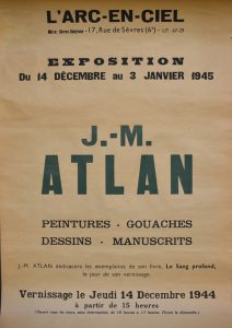 Planche typographique en noir et vert éditée pour son exposition personnelle de peintures, gouaches, dessins et manuscrits à L'Arc-en-Ciel rue de Sèvres à Paris. Dim. : 58 x 40 cm. En décembre 1944, a lieu la toute première exposition de Jean-Michel Atlan à la librairie-galerie de l'Arc-en-Ciel, quelques mois seulement après sa libération et un mois après la publication de son premier recueil de poèmes "Le Sang profond". Rare.