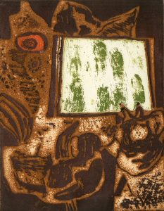 Eau-forte originale en couleurs tirée sur simili Japon, just. 8/25 et signée au crayon. Brux., Cap d'Encre, 1968, dim. support : 32,5 x 24 cm ; sujet : 24,5 x 19 cm (Belgeonne, Noir d'encre, 60)./ MARCHOUL (Gustave). Sans titre (1967). Lithographie originale en couleurs tirée sur simili Japon, signée à la craie blanche. Même édit., 1968, dim. support et sujet : 32,5 x 24 cm./ LAFFINEUR (Marc). Sans titre (1967). Eau-forte et linogravure en couleurs tirée sur simili Japon, datée et signée au crayon. Même édit., 1968, dim. support : 32,5 x 24 cm ; sujet : 17,5 x 20,5 cm./ Ens. 3 pièces.