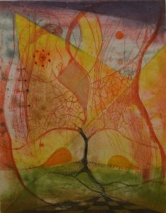 Eau-forte et aquatinte originale en couleurs tirée sur vélin d'Arches, titrée, just. E.A. et signée au crayon. P., Les Eglantines ; Atelier Leblanc, 1991, dim. support : 66 x 50 cm ; sujet : 36 x 28 cm (René Carcan, Catalogue raisonné, 770).