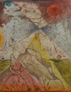 Eau-forte et aquatinte originale en couleurs tirée sur vélin d'Arches, titrée, just. 27/99 et signée au crayon. P., Les Eglantines ; Atelier Leblanc, 1990, dim. support : 66 x 50 cm ; sujet : 36 x 28 cm (René Carcan, Catalogue raisonné, 748).