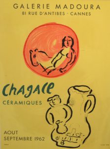 Lithographie en couleurs montée sous passe-partout et cadre en bois. Affiche réalisée par Charles Sorlier d'après un dessin de Chagall exécuté spécialement pour son exposition de céramiques à la Galerie Madoura à Cannes. Tirage limité à 500 ex. P., Impr. Mourlot, 1962, dim. cadre : 93 x 76 cm ; affiche : 65,5 x 48,5 cm (Sorlier, pp. 90-91).