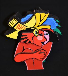 Sculpture. Relief en bois peint et assemblé, just. E.A. 10/15 et signé au coin infér. droit. Sculpture biface (sujets différents). Dim. : 34 x 26 x 6 cm.