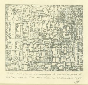 Mine de plomb sur papier, datée, signée et dédicacée à son épouse "petit dessin, pour accompagner le présent apporté à Esther, par le Père Noël, ce soir du 24 décembre 1974". Dessin monté sous passe-partout gris et cadre doré en bois. Dim. cadre : 33,5 x 34 cm ; sujet : 12 x 13 cm.