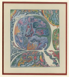 Crayon de couleurs sur papier, daté, signé au coin infér. droit et monté sous passe-partout et cadre en alu. Dim. cadre : 38,5 x 34,5 cm ; sujet : 18 x 14,5 cm.