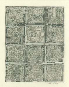 Mine de plomb sur papier, datée, signée au coin infér. droit et montée sous passe-partout de soie grise et cadre doré en bois. Dim. cadre : 35 x 30 cm ; sujet : 16 x 12,5 cm. Dessin repris dans le catalogue de son exposition personnelle à l'Hôtel de Ville de Bruxelles en septembre 1990 (p. 28). On joint ledit catalogue. Peintre, graveur, sculpteur, créateur de bijoux et de tapis, Cyrus Dubray (Fayt-lez-Manage, 1927 - Bruxelles, 1979) est un artiste autodidacte. Son oeuvre apparaît souvent comme une écriture automatique. À partir de 1970, il réalise des oeuvres montrant des structures cellulaires compliquées et souvent proches du fantastique. Oeuvres dans les collections privées et publiques (Musées royaux des Beaux-Arts de Belgique, Musée d'Ixelles, Banque nationale, ING, etc.).