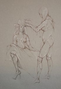 Pointe sèche originale tirée sur Arches teinté, just. 131/280 et signée au crayon. Timbre à sec à la tête de chat. Dim. support : 69 x 53 cm ; sujet : 40 x 30 cm.