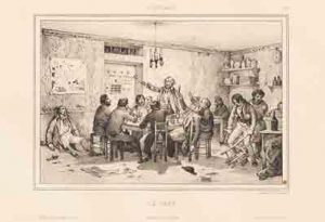 Adam (Victor). Album de Ste Pélagie (Dette). Douze scènes intérieures dessinées et lithographiées d’après nature. Paris, V. Morlot, sans date [vers 1830]. Album in-folio de (1) f. de couverture sur papier chamois, (2) ff., 12 lithographies