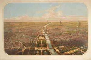 Paris depuis le sommet de l’Arc de Triomphe, dessinée et lithographiée par Léon-Auguste Asselineau : elle a été soigneusement coloriée à l’époque. Peintre paysagiste, cousin de l’écrivain Charles Asselineau, Léon-Auguste Asselineau (1808-1889) composa de nombreuses vues lithographiées de villes. “Il atransporté, sur le tard, son industrie en Normandie, ajoutant à ses spécialités celle de portraitiste de paquebots” (Inventaire du Fonds français I, p. 187 et p. 193 pour l’estampe).