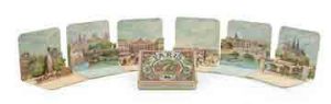 Arnal (Ch.). Paris. 6 vues. Paris, Mazerand, sans date [vers 1890]. 6 vues dépliantes à système réunies dans la boîte originelle de l’éditeur ornée, sur le couvercle, d’une image en couleur. Belle et rare boîte complète renfermant six vues