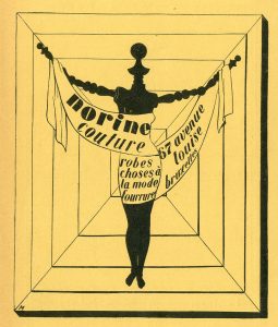 Publicité pour la maison de couture Norine tirée sur papier jaune. Planche extraite de la revue "Cahiers de Belgique" (mars 1928). Variante de la publicité publiée dans la revue "Le Centaure" : le mannequin articulé se découpe ici sur une succession d'encadrements au trait, formant un espace clos en perspective. Dim. support : 28 x 20 cm ; sujet : 19,4 x 16,2 cm (Schwilden, 125).