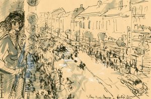 Encre de Chine sur papier avec rehauts d'aquarelle et de gouache, titrée, signée au bord infér. gauche et montée sous passe-partout. Dim. passe-partout : 30 x 40 cm ; support et sujet : 20 x 30 cm. Scène animée du retour des Diables rouges au plat pays après leur triomphe mexicain : "A l'aéroport de Zaventem, une foule immense nous attendait. Nous avons été escortés dans des voitures décapotables jusqu'à la Grand-Place de Bruxelles où une marée humaine noire-jaune-rouge nous a fait un triomphe" (Jean-Marie Pfaff).