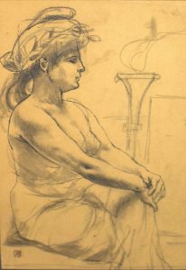 Fusain sur papier teinté avec rehauts à l'encre de Chine, monogrammé au coin infér. gauche et monté sous passe-partout gris et cadre noir en bois. Dim. cadre : 37,5 x 30 cm ; sujet : 21 x 14 cm.
