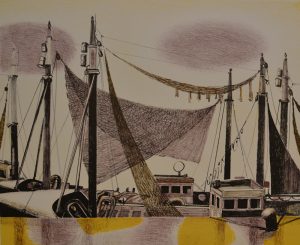 Ensemble de 6 lithographies en couleurs et 2 eaux-fortes en noir tirées sur papiers divers, toutes signées au crayon ou à l'encre. Format : (8 x) +/- 50 x 60 cm. Oeuvres des années 50 et 60 de Gustave Camus, Geo Mommaerts, Jean-Joseph Hoslet, José Crunelle, Willy Gilbert et Jacques Maes (2). La Société belge des peintres de la mer est créée en 1930 par les peintres de marines Maurice Pauwaert et Louis Royon et reste actif jusqu'en 1967. Bel ensemble.
