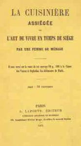 La Cuisinière assiégée ou l’Art de vivre en temps de siège par une femme de ménage. Paris, A. Laporte, 1871. In-8 de 36 pp., demi-percaline rose avec coins à la Bradel, couvertures de papier jaune conservées (reliure moderne). Rarissime