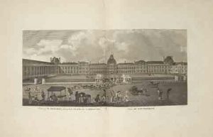 Reign of Buonaparte. With Descriptive Notices and Interesting Anecdotes. London, Harper and Co, 1816. Album in-folio de (1) f. de titre, (12) ff. de texte explicatif, 12 planches doubles : demi-veau rouge moderne à coins. Superbe album de 12 grandes vues de Paris gravées sur cuivre par Porter, Dadley, Angus et Sparrow à double page. Vue des Invalides ; Vue de Paris depuis le Sud : Vue depuis Montmartre ; Vue du Louvre (2) ; Place de la Concorde ; Jardin des Tuileries et Palais des Tuileries (3) ; Jardin du Luxembourg et Sénat : Champs Elysées et place de la Concorde ; Quai d’Orsay. Plaisant exemplaire. Une coiffe manquante.