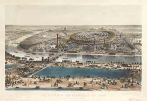 Superbe et grande vue cavalière des bâtiments de l’Exposition universelle de 1867 : dessinée et lithographiée par Provost, elle a été joliment coloriée à l’époque. L’Exposition se tint sur le Champ-de-Mars, là où, quelques années plus tard, fut érigée la tour Eiffel pour une autre Exposition universelle. Prise depuis les hauteurs du Trocadéro, la vue montre notamment le grand bâtiment ovoïde au centre. Elle est animée de nombreux promeneurs, calèches et omnibus. Sur la Seine, barques et bateaux à vapeur naviguent. Belle épreuve encadrée.