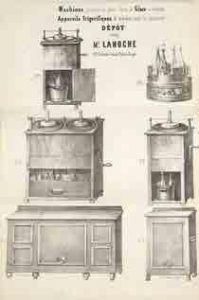 moyen de l’appareil frigorifique, suivies d’un recueil de recettes pour faire les glaces et les crêmes ou fromages glacés. Paris, au dépôt des machines frigorifiques, chez Lahoche, 1845. Plaquette in-8 de (2) ff., Iv pp., 120 pp., 1 planche repliée : chagrin rouge, dos lisse orné, double encadrement de filets dorés sur les plats avec fleurons dorés dans les angles, grand chiffre couronné doré au centre, coupes et bordures intérieures décorées, tranches dorées (reliure de l’ époque). Edition originale d’une grande rareté. Elle est illustrée d’une grande planche lithographiée et repliée hors texte figurant six “Machines portatives pour faire la glace à volonté. Appareils frigorifiques & mobiles pour la conserver. Dépôt chez Mr. Lahoche, 153 galerie Valois, Palais Royal.” Les pages 75 à 94 concernent les desserts, glaces et crèmes glacées ; les pages 118 à 120 donnent la description d’un appareil pour nettoyer les couteaux. Les appareils frigorifiques de Lahoche eurent un grand succès. Précieux exemplaire du roi Louis-Philippe Ier, avec son chiffre couronné doré au centre des plats. Mors supérieur fendillé. (Vicaire, Bibliographie gastronomique, 529.- Cagle, amatter of Taste, 287).