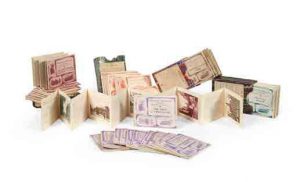 l’époque portant une étiquette imprimée. Rare collection complète des 51 itinéraires d’omnibus parisiens repliés en accordéon, imprimés recto et verso, et illustrés de photographies. Elle se divise en cinq séries contenues dans des étuis en papier avec la liste des itinéraires imprimée sur un papier collé. “Cette curieuse publication peut être considérée à la fois comme un guide des transports en commun, un guide de Paris, un témoignage photographique et un intéressant exemple d’impression. Elle décrit les parcours, les horaires et les correspondances de 27 lignes d’omnibus, 21 lignes de tramway et 2 lignes de bateaux. Trois des lignes choisies viennent d’être ouvertes pour les besoins de l’Exposition universelle. (…) Les cinquante textes qui décrivent brièvement chacun des itinéraires forment, à leur manière, un guide de la capitale. Les auteurs méconnus, E. Balysis et Jean Darcourt, outre des informations bien connues sur les monuments visibles sur le parcours, nous donnent de nombreuses notations pittoresques ou amusantes. (…) [Ils] donnent également quelques-unes des adresses des commerces les plus célèbres. (…) Chacun des itinéraires étant illustré par dix photographies, un ensemble de 500 images de petit format nous donne à voir le Paris de la Belle Époque. Il s’agit là sans doute de l’un des documents illustrés par la photographie qui contient le plus grand nombre de clichés, à cette date” (Alain Fourquier, Une curiosité unique en son genre in Magazine du Bibliophile). La cinquième série contient un onzième itinéraire, intitulé “Une visite à l’exposition”, présentant 20 photographies, sans texte. L’éditeur est mentionné : Marcel Duchemin. Ensemble bien conservé dans les étuis originels, excepté pour la cinquième série, à laquelle il manque l’étui. La première série est en seconde édition.