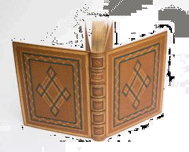 In-4, maroquin Lavallière, décor géométrique sur les plats avec multiples encadrements de filets dorés et listels de maroquin vert émeraude, ces mêmes filets et listels repris pour le motif losangé central, dos à 5 nerfs orné de même, doublure de maroquin vert émeraude avec encadrements de filets dorés, gardes de reps moiré chamois, tranches dorées sur témoins, couverture et dos, étui (Semet et Plumelle).