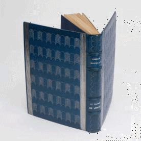 In-8, maroquin turquoise, décor au palladium sur l'ensemble des plats avec deux bandes de 9 filets verticaux sur les bordures encadrant de multiples points évoquant les fenêtres illuminées des palais vénitiens au bord de l'eau, dos à 5 nerfs orné des mêmes points, doublure de maroquin bleu avec filets horizontaux et petits points au palladium, gardes de soie moirée bleue, doubles gardes, tranches dorées sur témoins, couverture et dos, chemise demi-maroquin à bandes à recouvrements et étui (Semet et Plumelle).