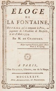 Chamfort, M. de. - Éloge de La Fontaine. Ouvrage qui a remporté le prix, au jugement de l’Académie de Marseille, le 25 d’août 1774. - À Paris : chez Ruault, 1774.