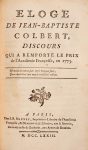 47 p., édition originale. Suivi de : Thomas, de l’Académie française. Éloge de Marc-Aurèle. À Amsterdam et se trouve à paris : chez Moutard, 1775. 72 p., un feuillet n. ch. Suivi de : Le Roi de Prusse [Frédéric II roi de Prusse]. - Éloge du jeune prince Henri de Prusse, mort à dix neuf ans de la petite-vérole, au mois de mai 1767. Cet éloge a été lu dans l’assemblée extraordinaire de l’Académie royales des sciences de Berlin le 30 décembre 1767. À Berlin : chez Chrétien Frédéric, 1768. 30 p. Suivi de : [ Jacques Necker]. - Éloge de Jean-Baptiste Colbert, discours qui a remporté le prix de l’Académie française, en 1773. - À Paris : chez J. B. Brunet, 1773.4 ff. n. ch. y compris le titre, 135 p., édition originale. Suivi de : Rémy, M. l’abbé, avocat au Parlement. - Éloge de Michel de l’Hopital, chancelier de France, discours qui a remporté le prix de l’Académie française en 1777. - À Paris : chez Demonville, 1777. 68 p. L’ensemble relié en un vol. in-8°, veau brun marbré, dos lisse richement orné et doré, tranches marbrées. Coiffe sup. arrachée. Belle réunion.