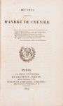 3 vol. in-8°, XLIV, 428 p., 2 ff. n. ch. ; 434 p., 2 ff. n. ch. ; XLIV, 406 p., 1 ff. n. ch. , veau blond marbré, dos lisses richement ornés et dorés, pièces de titre et de tomaison anthracite, filet et roulette dorés en encadrement autour des plats, tranches marbrées. Portrait de l’auteur en frontispice du t. 1, quelques rouss. légères, coins émoussés. Agréable ensemble auquel nous joignons : Œuvres complètes d’André de Chénier. Paris : Baudoin Frères,Foulon et Cie, 1819. Un vol. in-8°, XXIII, 396 p., VIII p. de musiques pour La Jeune captive, veau blond, dos lisse richement orné et doré, pièce de titre anthracite.