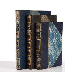 Longus. - Les Pastorales ou Daphnis et Chloé. - Paris, Georges Crès et Cie, Les Maitres du Livre, 1914. In-8° de 306 pp., couverture originale illustrée conservée. Demi-maroquin bleu nuit à coins, dos à nerfs orné de compartiments de filets dorés et motifs de fleurs stylisées de maroquin rouge (reliure de H. Blanchetière).