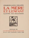 Philippe, Charles-Louis. - La Mère et l’Enfant illustré par Deslignères. - Paris La Nouvelle Revue Française, 1920. Grand in-8° de 3 ff.- 86 pp, ill.de 12 bois, couverture originale illustrée conservée, Un des 290 exemplaires numérotés (38). Demi-maroquin vert à coins, dos à nerfs orné de compartiments de filets dorés et motifs floraux stylisés (reliure mosaïquée de Canape).
