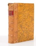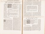 Un vol. petit in-4°, titre avec belle marque typographique gravée sur bois, lettrines, 3 ff. n. ch., 389 ff. chiffrés ( mais en réalité 392 et un feuillet n. ch. en raison d’erreurs de numérotation des pages), demi basane blonde, dos à nerfs soulignés de filets dorés, tranches dorées. Coiffe sup. arrachée, charnières fendues, annotations manuscrites anciennes, bon état int. Le texte latin est encadré par le texte italien.