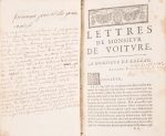 Un vol. In-12, Portrait (manque de papier dans la marge), frontispice, titre, 6 ff. n. ch., 484 p. (il manque la page 429-430),5 ff. n. ch. Suivi de : Poésies de Monsieur de Voiture, 144 p. (il manque la p. 25-26) ; suivi de : Nouvelles œuvres de Monsieur de Voiture. - Imprimées à Rouen et se vend à Paris, chez Augustin Courbe, 1660. 130 p., 5 ff. n. ch., veau brun, dos à nerfs richement orné et doré, double rang de filets dorés en encadrement autour des plats, charnières sup. fendues. Notes manuscrites anciennes.