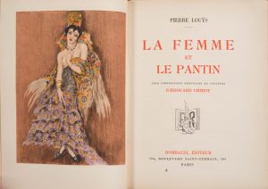 Louÿs, Pierre. - La Femme et le pantin. Cinq compositions originales en couleurs d’Édouard Chimot. - Paris : Rombaldi, 1937.