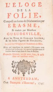 [Holbein] - Erasme. - L’éloge de la folie, composé en forme de déclamation par Erasme et traduit par Monsieur Gueudeville, avec les notes de Gérad Listre, et les belles figures de Holbein ; le tout sur l’original d el’ Académie de Bâle...