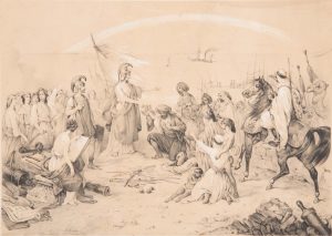 In-folio à l’italienne, broché, couverture manquante. Recueil de planches seul (texte manquant), comprenant le frontispice, 103 lithographies à deux teintes de vues et portraits dont 1 en double exemplaire, 2 cartes in fine. L’atlas est incomplet. Il manque 40 planches dont entre autres le titre chromolithographié, les planches de la 5e et dernière partie (Races Algériennes, Monnaies, Flore d’Algérie). Atlas en mauvais état, importante mouillure en marge sup., touchant parfois le haut de la lithographie, rousseurs (une douzaine de planches uniformément roussies), une planche volante. La partie lithographiée conserve toutefois assez fréquemment sa fraîcheur.