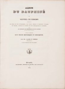 Magnifique recueil sur le Dauphiné, contenant 143 (sur192) lithographies, accompagnées de texte historique. Les lithographies ont été gravées par C. Pégeron, à Grenoble.