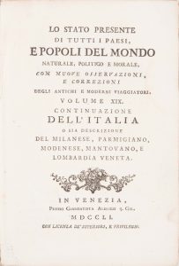 Lo Stato presente di tutti i paesi, e popolo del mondo naturale, politico e morale, con nuove osservazioni, e corezioni degli antichi e moderni viaggiatori. Volume XIX. Continuazione dell’Italia o sia descrizione del Milanese, Parmigiano, Modenese,...